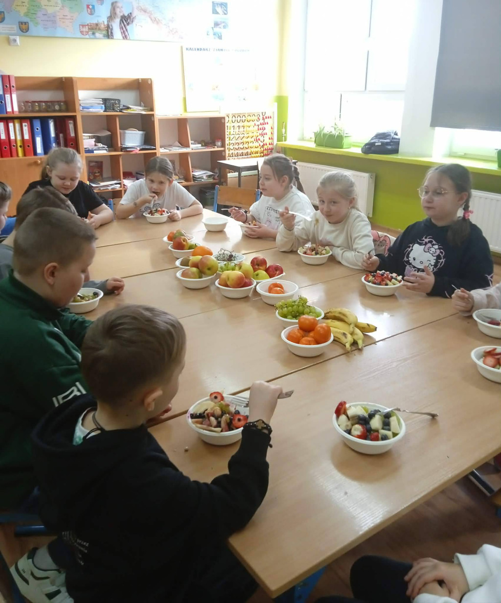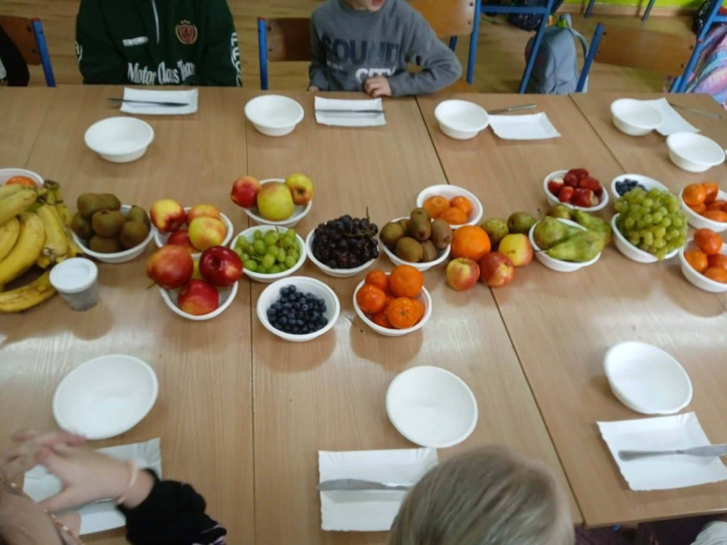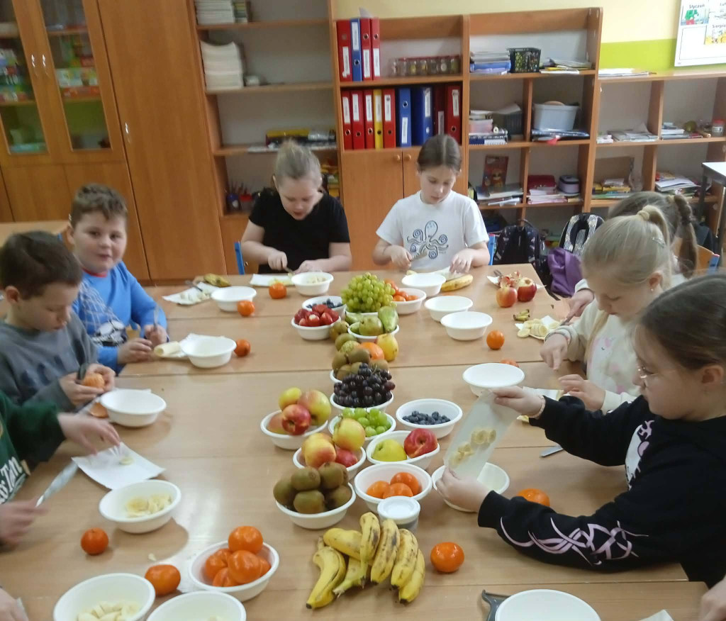 Na zajęciach technicznych w klasie 2, pod kierunkiem wychowawczyni p. E. Kałuzińskiej, uczniowie z zaangażowaniem przygotowali pyszną i zdrową sałatkę owocową. Dzieci samodzielnie kroiły owoce, zachowując zasady bezpieczeństwa i higieny pracy, a następnie wspólnie komponowały kolorowe porcje pełne witamin.