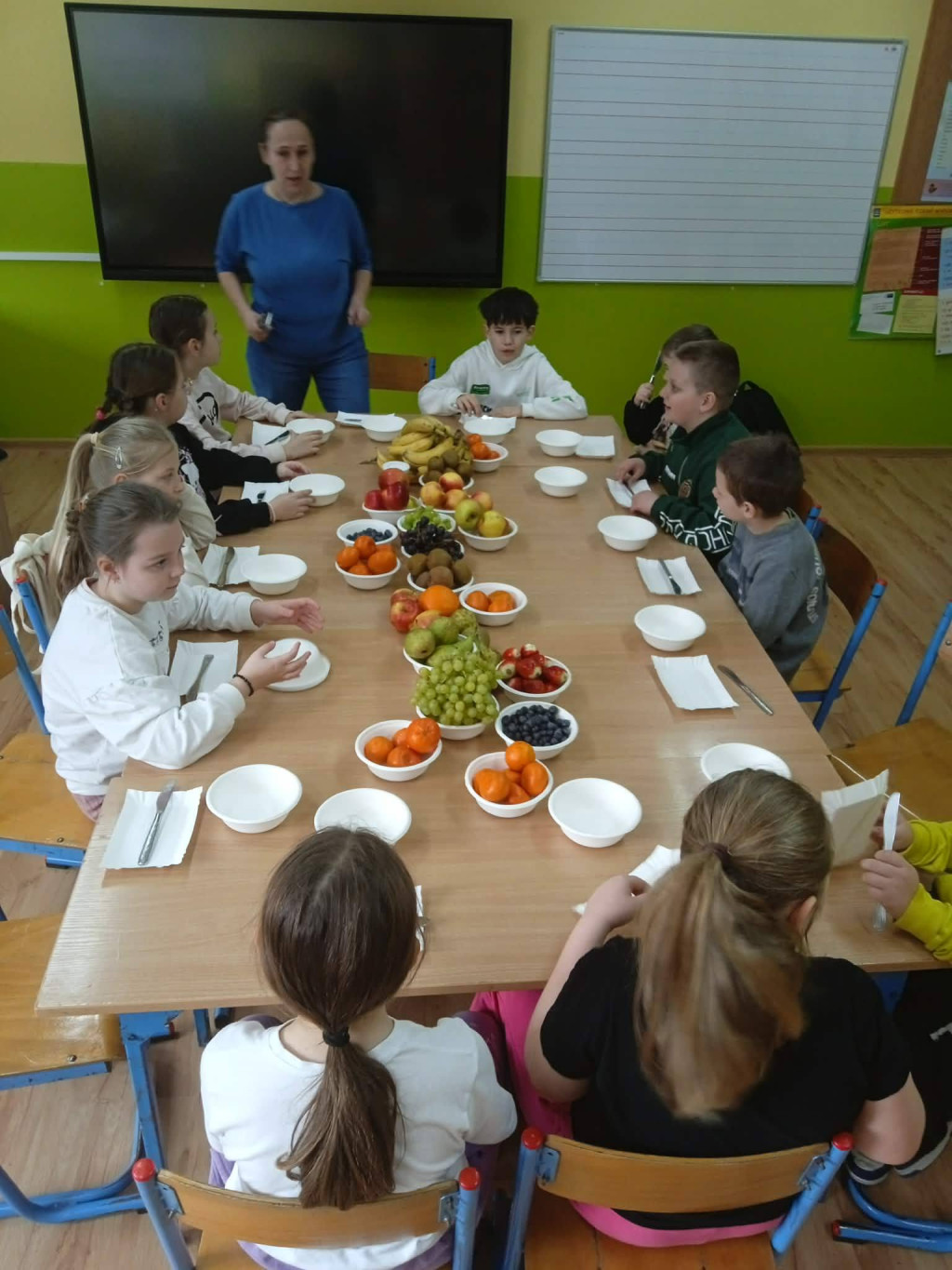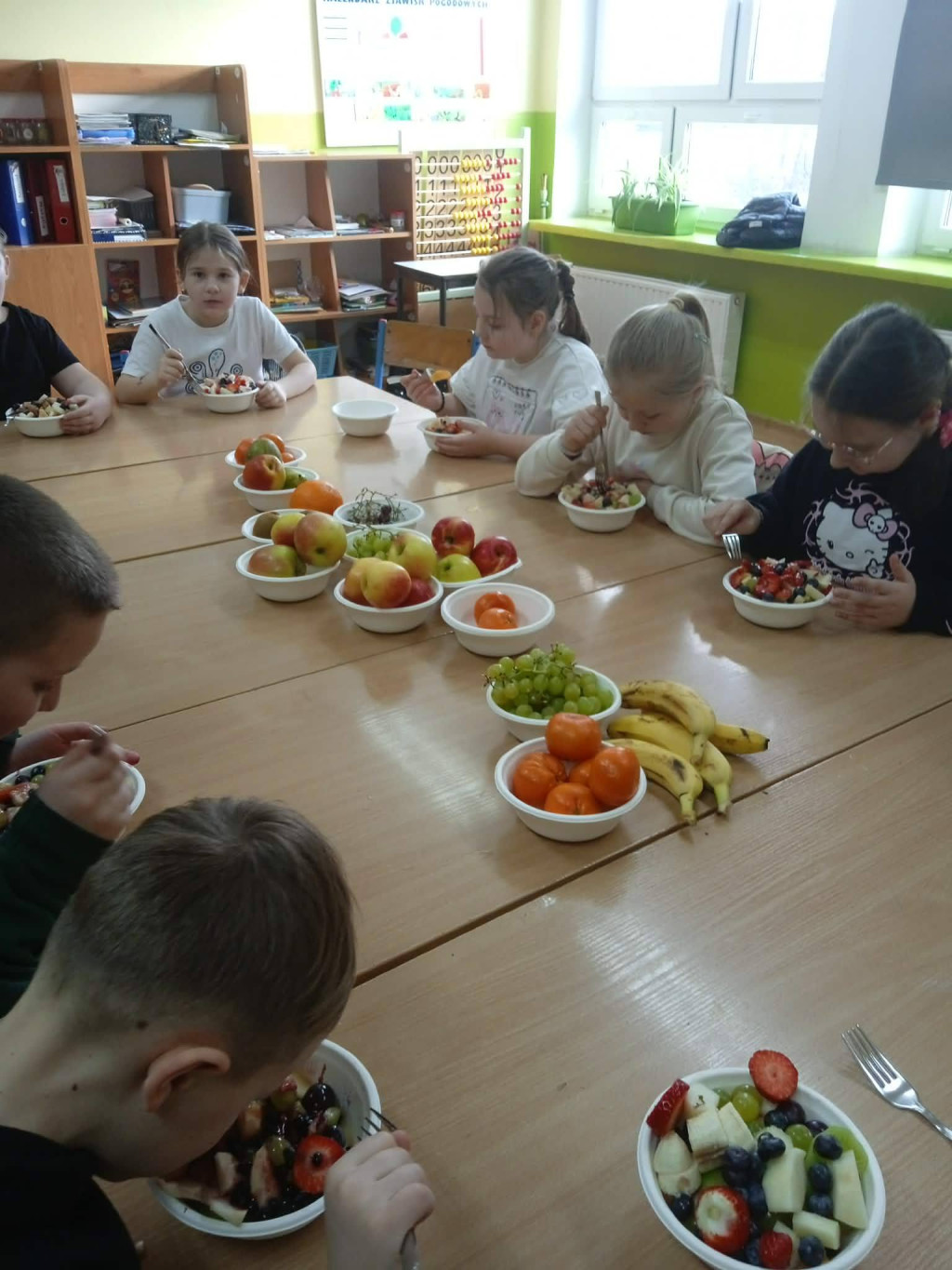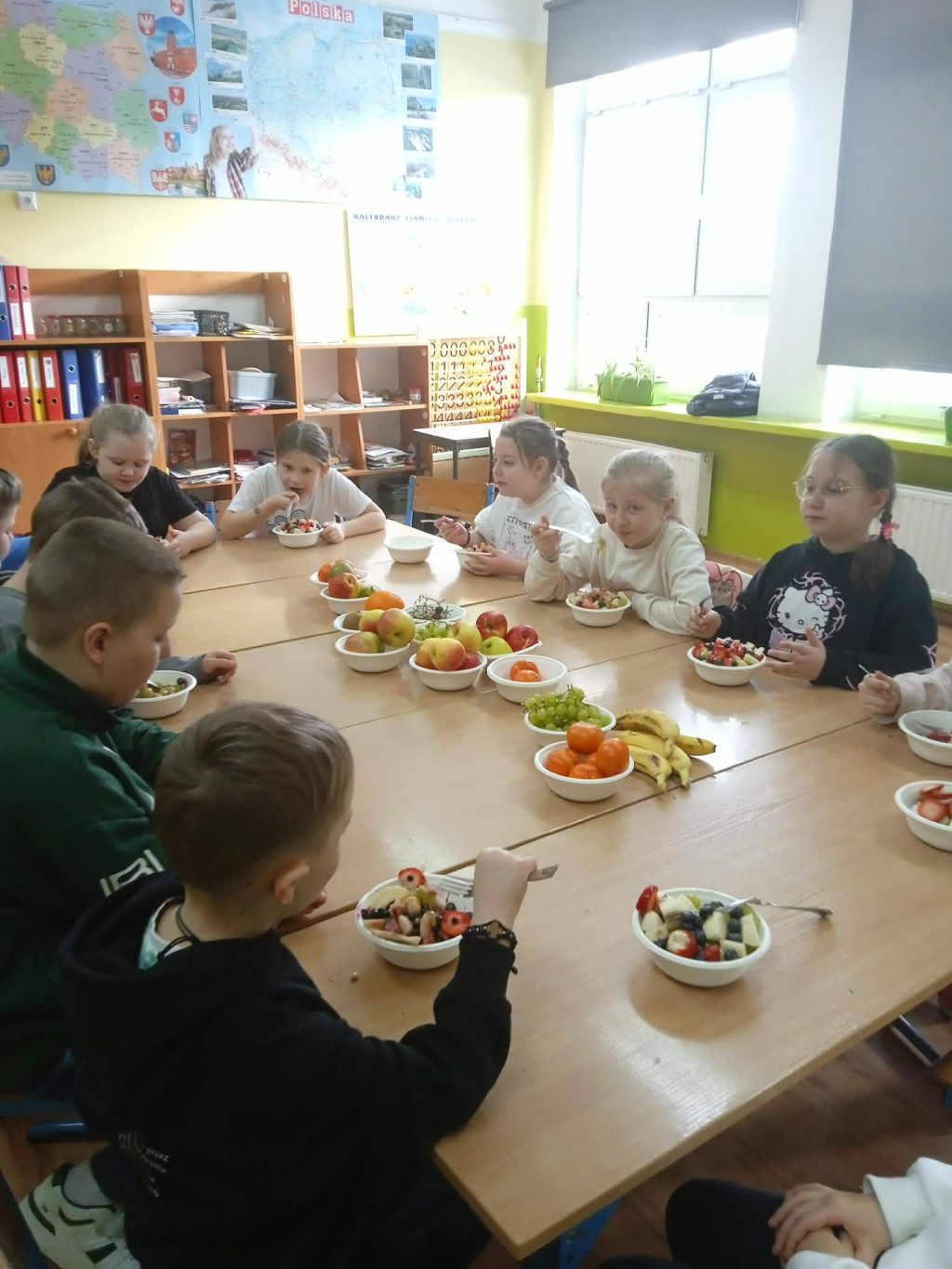 Na zajęciach technicznych w klasie 2, pod kierunkiem wychowawczyni p. E. Kałuzińskiej, uczniowie z zaangażowaniem przygotowali pyszną i zdrową sałatkę owocową. Dzieci samodzielnie kroiły owoce, zachowując zasady bezpieczeństwa i higieny pracy, a następnie wspólnie komponowały kolorowe porcje pełne witamin.